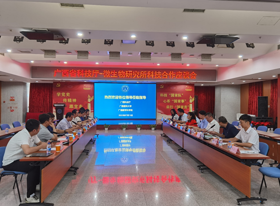 7月12日,广西省科技厅党组成员姚作芳、广西医学科学院张国副院长、吕向劼副院长、广西医科大学科技处处长李浪等一行来我所调研、洽谈合作。微生物所所长钱韦研究员,科研代表叶健研究员、刘翠华研究员、朱宝利研究员、刘宏伟研究员、杨怀义研究员,科技战略规划与重大项目处、知识产权与产业发展处相关同志出席了座谈。