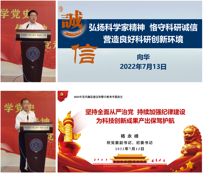 党委副书记、纪委书记杨永峰作题为《坚持全面从严治党 持续加强纪律建设 为科技创新成果产出保驾护航》的党风廉政建设和警示教育专题报告。领学了习近平总书记在中共中央政治局第四十次集体学习讲话精神,讲解了院党组政治巡视的相关要求,并结合丰富案例重申了中央八项规定精神的主要内容,要求科研工作者和行政管理人员从典型案例中汲取教训、引以为戒,规范自身言行,遵纪守法。