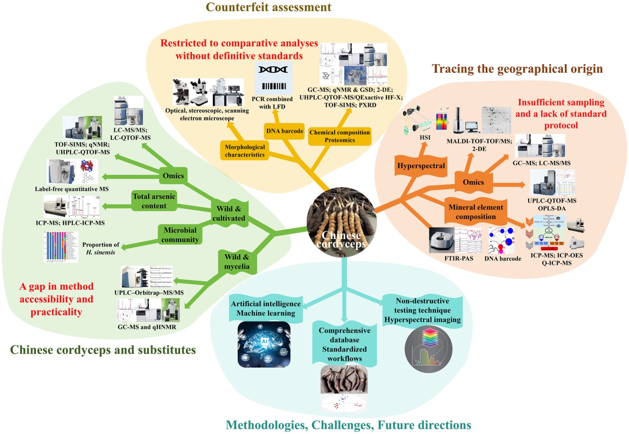在此基础上,团队近期在Critical Reviews in Biotechnology发表题为“Chinese cordyceps products ,geographic traceability and authenticity assessment: current status ,challenges ,and future directions”的论文。系统梳理了冬虫夏草的市场流通现状,总结了市售产品的主要类型,揭示了虚假标注、替代掺假、人工增重等典型欺诈行为,并总结了现有的溯源鉴别技术。研究提出,未来应融合人工智能与高光谱成像等技术,构建快速、无损的产地溯源与识别体系,为市场监管与消费者权益保护提供技术支撑。