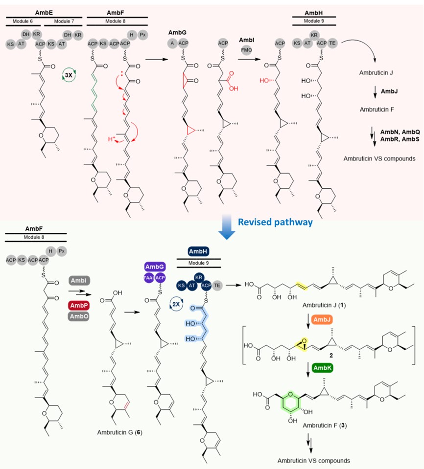 针对上述技术瓶颈,研究团队成功建立了一套高效的堆囊菌属黏细菌遗传操作体系,在多种以往难以进行遗传改造的菌株中实现了稳定、高效的基因操作,有效突破了传统方法效率低、适用范围窄且高度依赖菌株特异性的局限;基于该技术平台,团队进一步对堆囊菌来源的代表性化合物安布替星的生物合成机制开展了深入研究,揭示了环氧水解酶AmbK在六元氧杂环构建及聚酮合酶AmbH在聚酮骨架迭代延伸过程中的关键催化功能。该研究成果修正了领域内对该化合物生物合成路径长达近二十年的认知(图1),为后续代谢途径改造与衍生物开发奠定了重要理论基础。