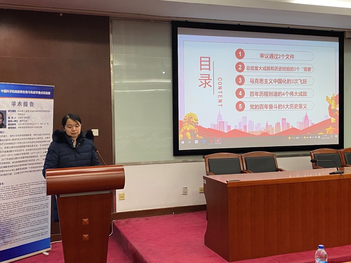 会议随后由支部书记王硕给全体党员做了“学习贯彻十九届六中全会公报内容,为实现第二个百年奋斗目标努力奋进”的专题报告,回顾了十九届六中全会公报内容,并结合本支部的情况希望党员同志们能够立足新时期微生物学国家战略科技力量定位,当好“国家队”“国家人”,心系“国家事”,肩扛“国家责”,以重大原始创新、重大技术突破、重大成果产出为己任,为实现第二个百年奋斗目标的贡献自己的力量。