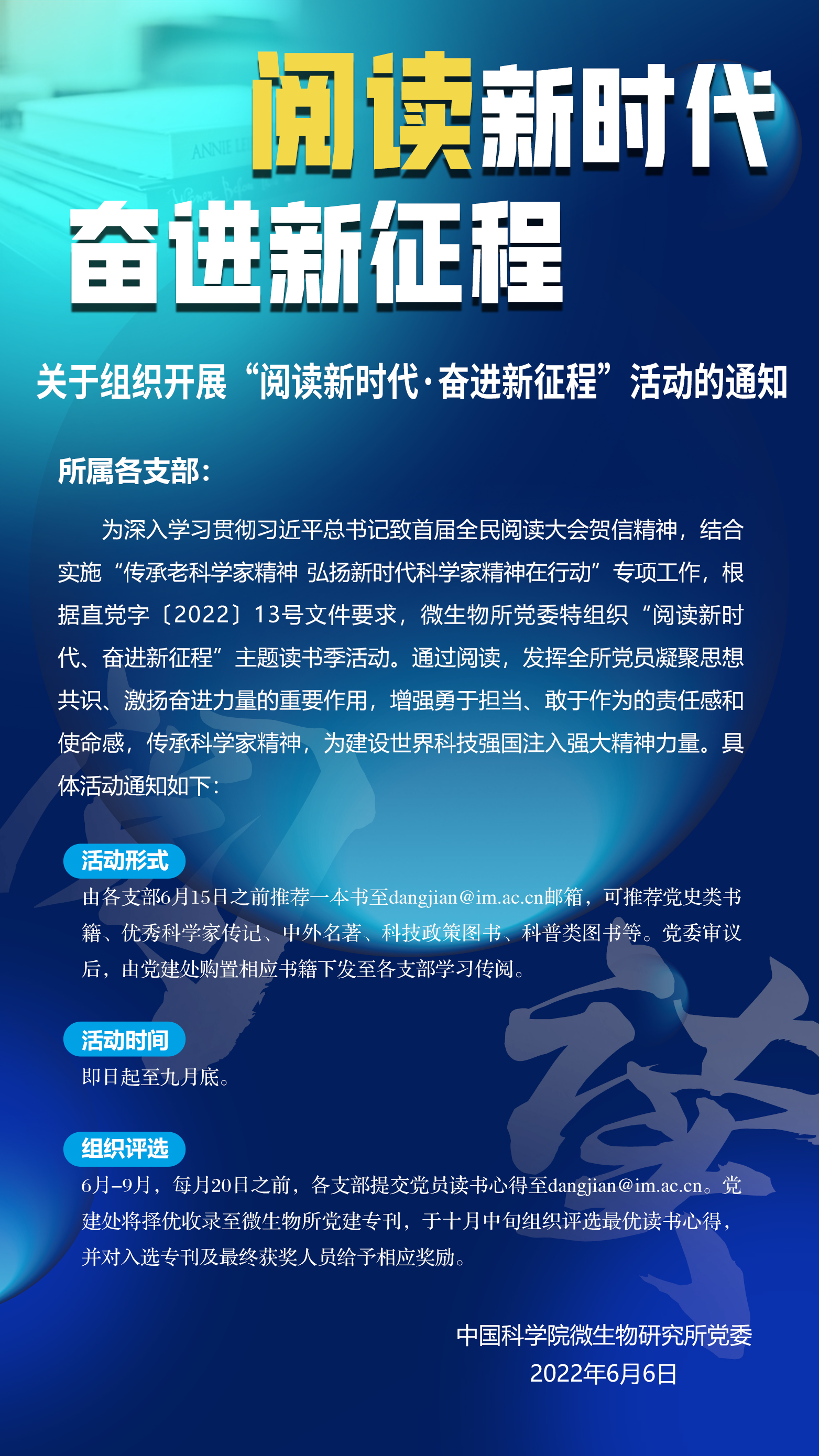 活动形式:由各支部6月15日之前推荐一本书至dangjian@im.ac.cn邮箱,可推荐党史类书籍、优秀科学家传记、中外名著、科技政策图书、科普类图书等。党委审议后,由党建处购置相应书籍下发至各支部学习传阅。