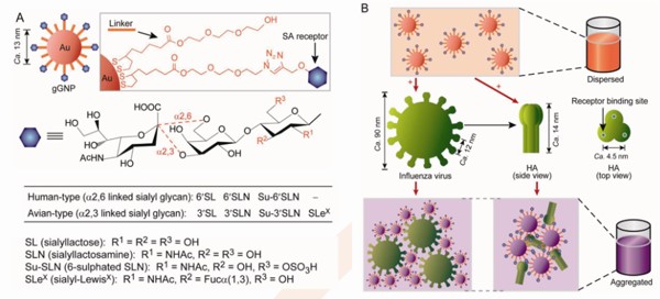 Fig 1. Analysis of influenza virus receptor specificity using glycan-functionalized gold nanoparticles.(ACS nano2014;Biosensors and Bioelectronics2017)