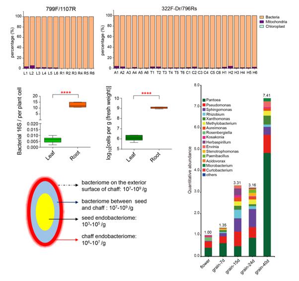 代表性进展2:建立植物内生微生物组16S测序技术并解析水稻微生物组的种传模式。设计细菌16S rDNA特异引物,排除植物线粒体和叶绿体DNA的共扩增,实现对植物内生细菌组的测序和定量分析。证明水稻全谷粒结构携带大量共生微生物,在种子成熟过程中获取并能传播至下一代植株。 | ||