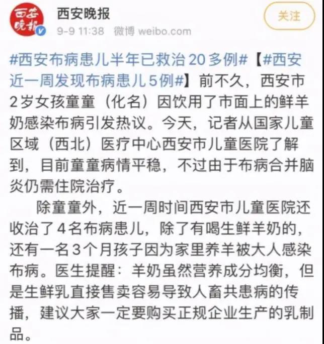 此外,食用未经消毒的乳汁或其制成的乳制品也是极为常见的感染方式之一。当绵羊、山羊、奶牛和骆驼遭受感染后,这类动物的乳汁会被布鲁氏菌所污染。特别是很多人追求所谓“天然新鲜”,会在市场上购买未经正规食品检疫、未经严格消毒的鲜奶或奶制品,如果这些鲜奶被布鲁氏菌感染了,而且在加工成奶制品的过程中也没有消毒,那么食用鲜奶或鲜奶做成的奶制品,也容易被感染。近期,西安交通大学第二附属医院就收治了一批感染布病的婴幼儿患者,他们的患病原因就是直接饮用了未严格消毒的被布鲁氏菌污染的生鲜羊奶。