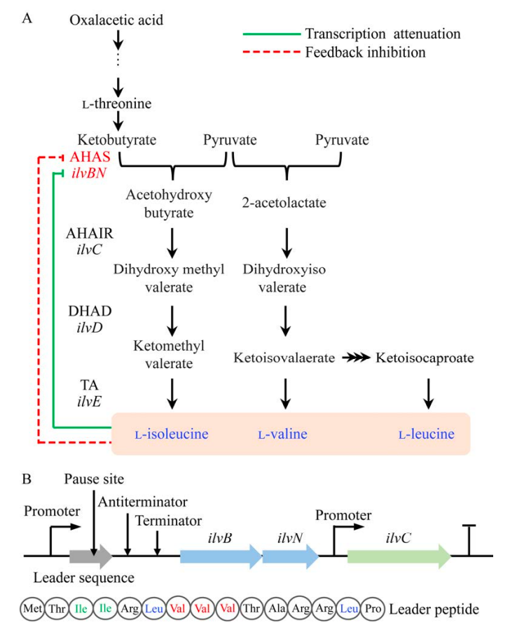 支链氨基酸合成途径及 ilvBNC 操纵子的转录调控 A:支链氨基酸合成途径. B:ilvBNC 操纵子的转录调控|生物工程学报,2024, 40(9): 3114-3126