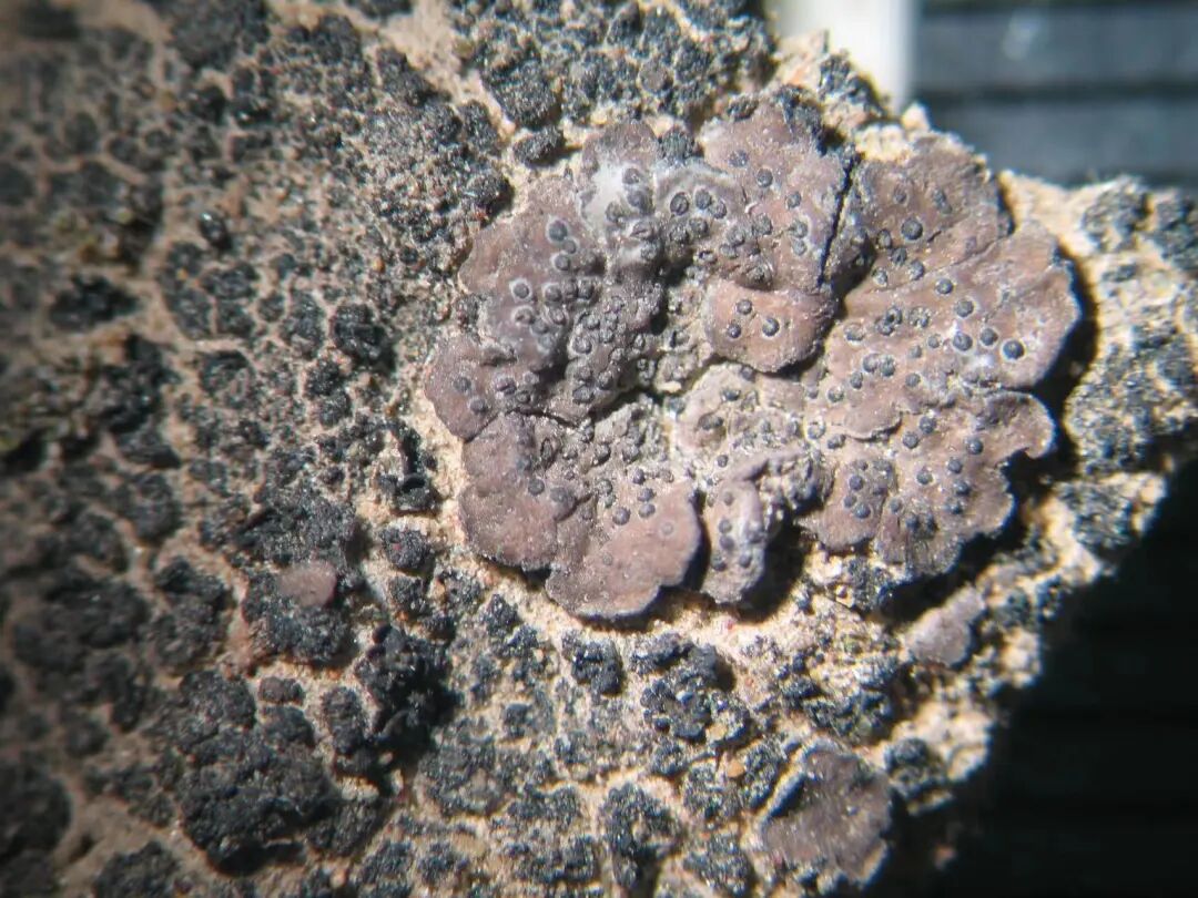 荒漠石果衣Endocarpon deserticola呈褐色的地衣体,地衣体上表面黑色点状物为子囊壳,是真菌的一类有性繁殖结构,可以产生类似植物种子的孢子(照片由中国科学院微生物研究所魏鑫丽研究员摄于实验室)