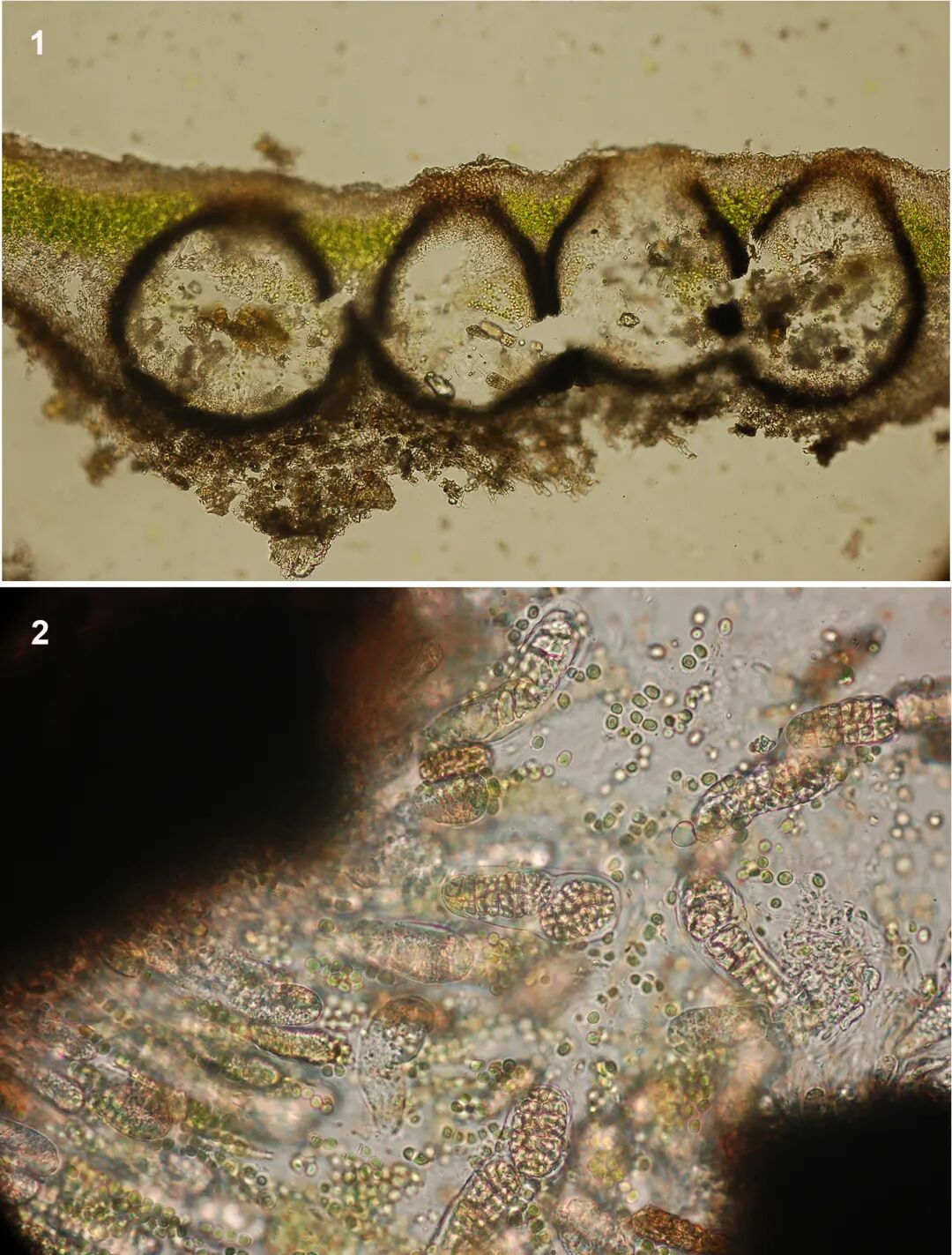 石果衣Endocarpon地衣体连同子囊壳的显微结构。1.地衣体内形成的层次结构,绿色部分为被石果衣真菌包裹的柯氏复球藻,烧瓶状的子囊壳埋生在石果衣地衣体内,开口于地衣体上表面,以利于向外释放孢子;2.子囊壳内呈砖壁网格形态的孢子与藻细胞混生在一起,孢子向外释放时藻细胞会连同一起释放(照片由中国科学院微生物研究所魏鑫丽研究员摄于实验室)