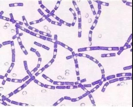 高倍显微镜下的杆状菌体及芽孢