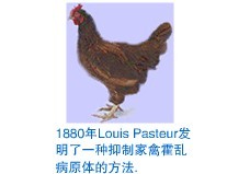 Louis Pasteur (1822~1895) 法国微生物学家,化学家。1822年12月27日生于法国多勒,1895年9月28日卒于巴黎附近的圣克洛德。1839~1842年在贝桑松(Besancon)皇家学院学习,1843~1846年在巴黎高级师范学校学习,1845年获硕士学位,1847年获博士学位。1849~1854年任斯特拉斯堡大学理学院化学教授;1854~1857年任里尔大学理学院院长和化学教授;1857~1867年任师范学院的主管行政管理和科学研究的主任。1862年被选为法国科学院院士。1863~1867年兼任巴黎美术学校教授;1867~1874年任巴黎大学化学教授。1867~1888年任高等师范学校生理化学实验室主任。1882年被选为法兰西学院院士。1888~1895年任巴斯德研究所所长。 他的科学生涯始于学生时代,1847年他研究酒石酸的旋光性,发现酒石酸有右旋和左旋现象,经过10年研究后提出分子不对称性理论,开创了立体化学研究的途径。在里尔他从事发酵、酿造的研究。1857年他发现某些细菌能导致乳酸发酵。他研究酵母的酒精发酵及其他微生物的发酵作用,证明了发酵是微生物活动的结果,不同微生物引起不同类型的发酵,创立了发酵的生物学理论,也解决了当时酿酒业发展中的难题,发展了制醋的标准化工艺。他还用实验证明了食物与细菌接触才导致腐败,从而否定了自然发生说,并建立了至今还在使用的消灭酒中杂菌的低温消毒技术即巴斯德消毒法。他经过5年研究,找出了威胁法国养蚕业的“蚕瘟”的病原体蚕微粒子,并提出了防治措施。他还研究了蚕的软化病,发现了致病的弧菌。1868年他因病身体部分瘫痪,但仍继续进行研究工作。1877年以后研究了人畜的多种传染病如炭疽病、气性坏疽、鸡霍乱、疔疮、骨髓炎、产褥感染、猪丹毒和狂犬病等。他成功地分离出并在实验室中培养了炭疽杆菌,研究了病原菌的性质。1880年他又分离出鸡霍乱菌,并发现弱化的霍乱菌不能致病却能使鸡获得免疫,根据这一发现,他用经高温培养弱化了的炭疽病菌,对炭疽病试行防治,取得预期效果。对狂犬病的研究是他科学生涯中最后、也是最重要的一项工作。他将狂犬患者的唾液注射到兔子体中,使兔感染狂犬病后,再将兔的脑和脊髓,制成可供免疫用的弱化疫苗,并于1885年在一个 9岁的被患狂犬病的狼咬伤的孩子身上试用,获得成功。这一研究成果当时被誉为“科学纪录中最杰出的一项”。巴斯德研究所就在那时筹款建立,最初作为抗狂犬病的研究中心,私人捐赠来自世界各地,捐赠者中包括俄国沙皇、土耳其苏丹和巴西皇帝。1888年巴斯德研究所正式落成,巴斯德担任所长,直到他逝世。 巴斯德一生获得了极大的科学成就,从而获得多种荣誉和奖励。1887年被选为法国科学院永久秘书;1892年巴黎大学为庆祝巴斯德70寿辰举行了盛大的国际性庆典。