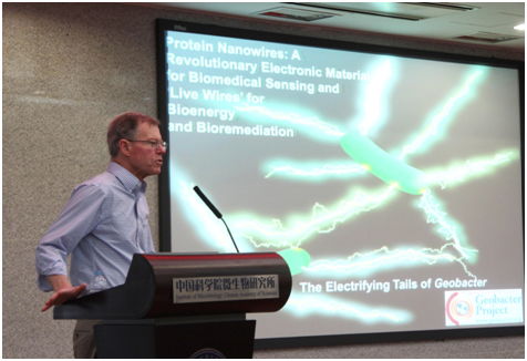 Lovley教授的报告系统介绍了地杆菌纳米线(nanowires)的发现及其生理生化功能、结构组成及分子机制、遗传工程改造及其应用于医学传感器、新型生物能源、生物修复及生物地球化学等领域的前沿研究。该报告会由向华研究员主持,黄力研究员、黄英研究员、冯婕研究员、刘芳华研究员、张立新教授及来自本所和北京大学等的师生参加了本次学术报告。会上大家踊跃提问,Lovley教授对老师和学生们提出的问题作了详尽的解答。会后向华研究、黄力研究员、黄英研究员还与Lovley教授进行了深入交流,对未来可能的合作领域达成了初步意向。