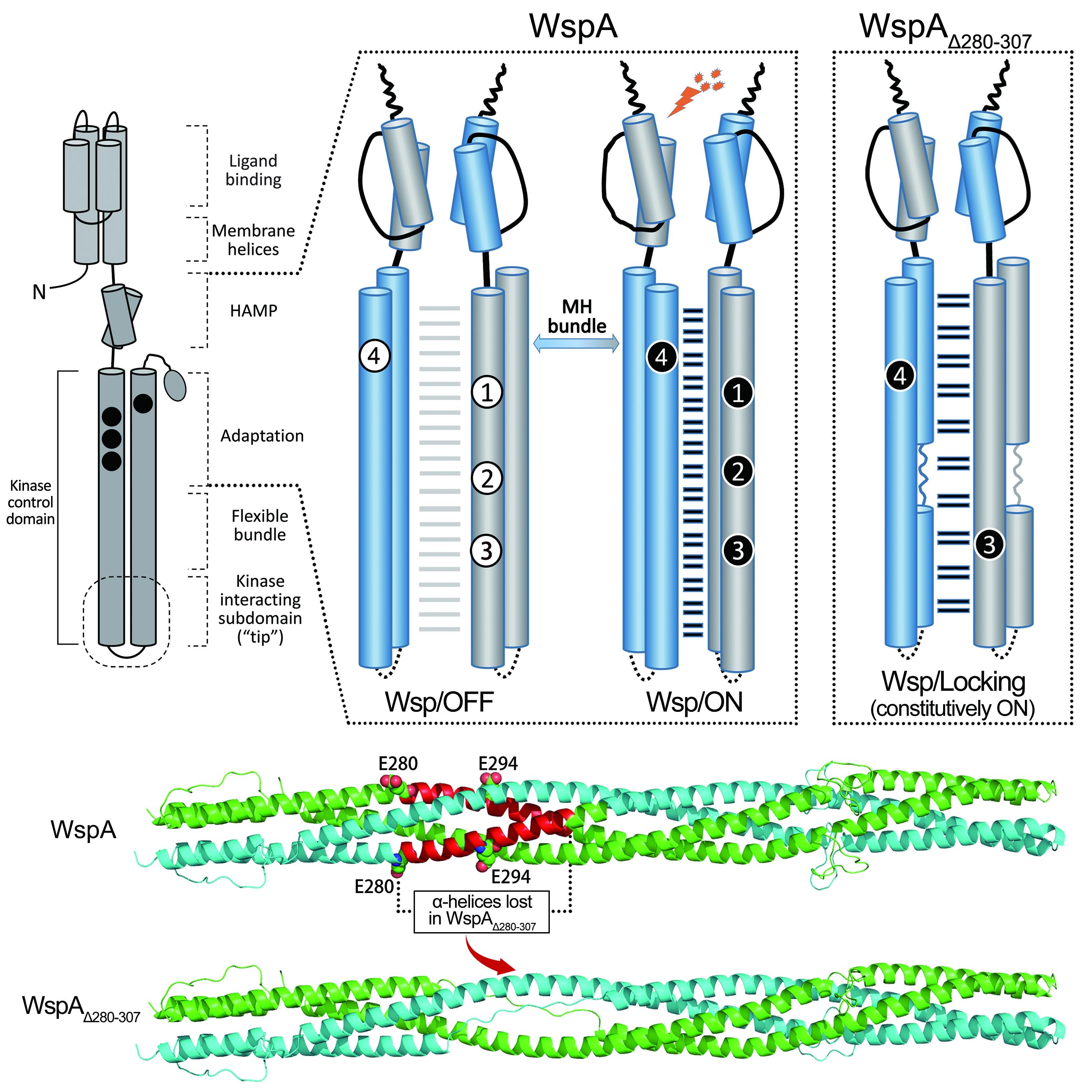 中国科学院微生物研究所马旅雁团队对石油分离的两株铜绿假单胞菌进行了全基因组测序,分析发现两株菌株基因组高度同源(identity>99.99%),但其中一株表现为形成超级生物被膜的小菌落皱褶表型。SNP分析结合分子生物学验证揭示该菌甲基化趋化受体蛋白WspA的小片段缺失是导致菌株超级生物被膜形成的原因。WspA蛋白是Wsp系统中的信号感应受体蛋白,通过甲基化或去甲基化两种修饰形态决定着Wsp系统的激活或关闭。WspA第280-307氨基酸残基片段的缺失导致该蛋白将Wsp系统锁定在持续激活的状态。Wsp系统在铜绿假单胞菌中通过调控胞内第二信使cyclic-di-GMP的合成从而协调细菌运动和生物被膜形成,Wsp系统的持续激活导致了胞内cyclic-di-GMP的持续积累,从而抑制细菌运动,促进胞外多糖的合成,形成超级生物被膜。此外,马旅雁团队通过Orbitrap对WspA蛋白的甲基化位点进行鉴定,发现在WspA有小片段缺失的280-307氨基酸区域存在两个甲基化位点E280和E297。推测甲基化位点的缺失导致WspA蛋白无法被甲基化和去甲基化修饰,从而导致Wsp系统被锁定在持续激活的状态。WspA同源蛋白序列比对显示在发生氨基酸片段缺失(aa280-313)的区域有三个保守的重复序列,表明相应DNA编码区域内的自发缺失可能是基因内部片段重组的结果。该重复序列在几个相关的菌属和生境类似的细菌的WspA中均存在,提示了类似突变发生的普遍性。WspA的小片段缺失在临床分离的RSCV中也很常见。该研究结果阐明了铜绿假单胞菌超级生物被膜形成的机制以及该菌在特殊环境中获得竞争优势的原因。