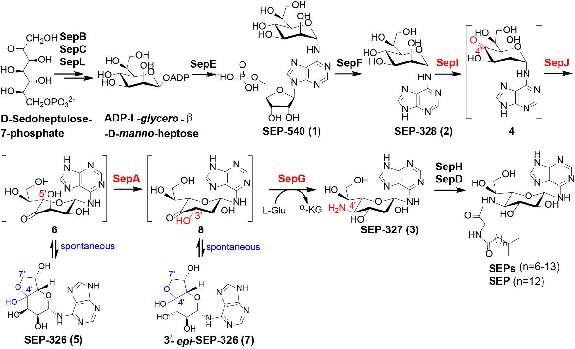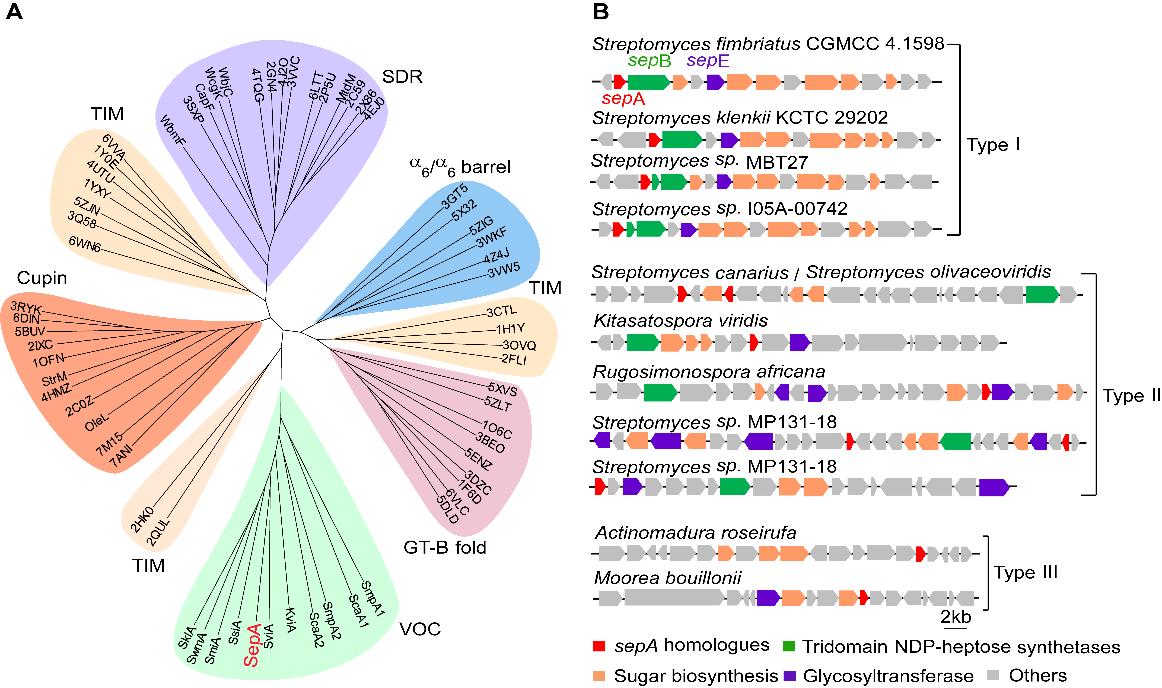 2022年8月3日,该研究以Insights into the biosynthesis of septacidin L-heptosamine moiety unveils a VOC family sugar epimerase为题,在Acta Pharmaceutica Sinica B正式刊出。陈义华研究组博士生陈萌、副研究员郭正彦博士(现于中国医学科学院北京协和医学院药物生物技术研究所工作)和吴边研究组硕士生孙瑨原为论文并列第一作者,陈义华研究员和吴边研究员为论文共同通讯作者。研究工作得到了科技部重点研发计划、国家自然科学基金委杰出青年基金和面上项目的资助。