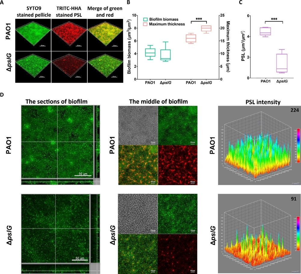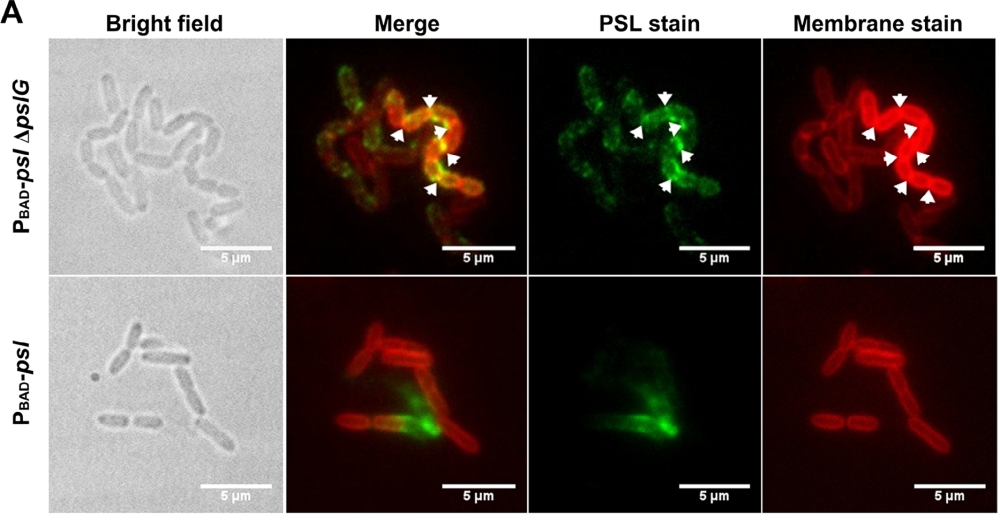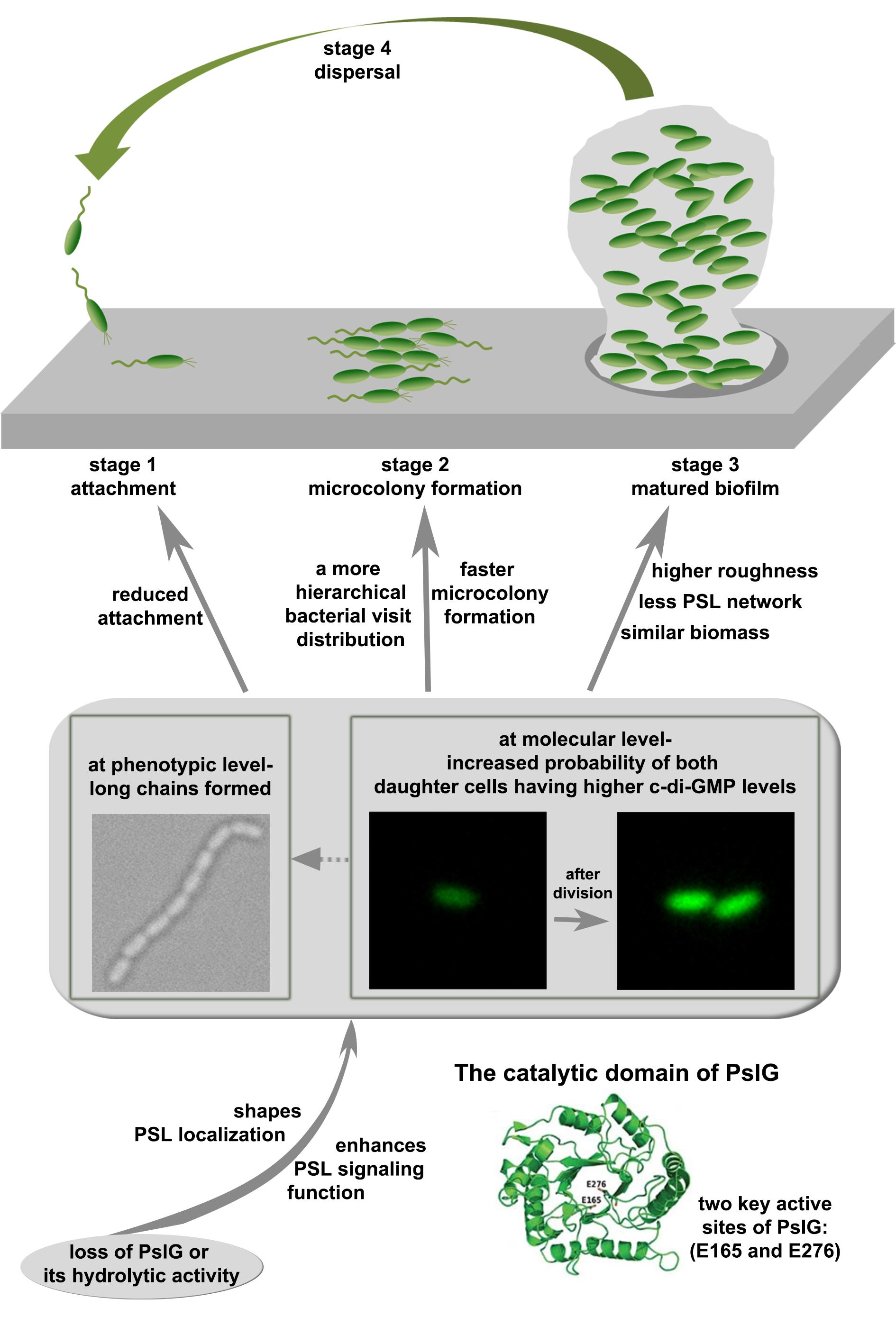 铜绿假单胞菌是一种条件致病菌,是生物被膜研究的模式菌株之一。编码PslG的基因位于由15个基因组成的PSL多糖基因簇中,该基因簇负责合成铜绿假单胞菌关键生物被膜基质多糖PSL。近日,马旅雁研究组与天津大学赵坤教授团队开展合作研究,发现铜绿假单胞菌缺失PslG蛋白或丧失其水解活性会增强PSL多糖的信号功能,并改变胞内二级信使cyclic-di-GMP的水平。该研究运用单细胞观测技术,揭示了PslG蛋白缺失影响细胞分裂后的c-di-GMP在两个子细胞中的分布和浓度, c-di-GMP局部浓度增加会限制细菌细胞的运动能力,同时影响PSL多糖的产量和其在细胞表面的分布。c-di-GMP和PSL多糖的分布改变会导致部分菌细胞分裂后不分离,从而形成长链,快速形成生物被膜微菌落,进而影响生物被膜的发育。外源添加PslG蛋白,则会消除长链现象,证明PslG蛋白在细胞命运和生物被膜发育中起到关键作用。