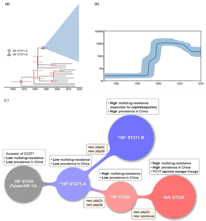 研究团队对时间跨度14年的1312株肺炎链球菌进行了基因组测序及耐药表型分析,与来自全球肺炎链球菌基因组测序计划(GPS)的数据相结合,进行系统基因组学分析。结果显示,当前在CC271克隆群中主导的两个克隆(19F ST271-B和19A ST320),均是从同一个低耐药的祖先克隆(19F ST271-A)中分别独立演化而来。其中第一优势耐药克隆为19F ST271-B,它对β-内酰胺高水平耐药,且对头孢菌素类药物具有尤为高的耐药性。贝叶斯分析显示19F ST271-B在1995年至2000年间迅速扩散,这可能与1990年代头孢菌素在中国的广泛使用相关;CC271中占比第二的19A ST320耐药克隆是疫苗逃逸株,贝叶斯分析显示19A ST320于2001年在中国开始迅速扩散,与2000年美国推出PCV7疫苗的时间点较为吻合,展现了疫苗接种对全球耐药克隆流行的影响。该研究结果对于理解肺炎链球菌耐多药克隆的形成机制及开发有效的防控策略具有重要意义。