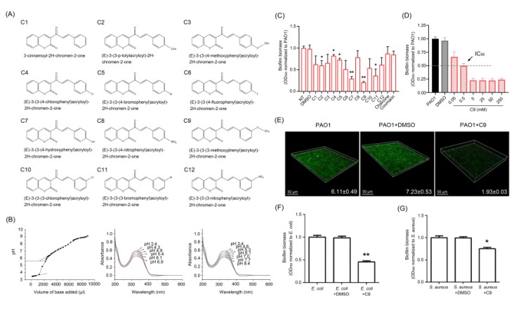 研究团队使用香豆素与查尔酮单体合成了几十种小分子香豆素-查尔酮共轭物。通过检测这些化合物对铜绿假单胞菌生物被膜的影响,发现C9能够显著抑制铜绿假单胞菌生物被膜的形成,对金黄色葡萄球菌以及大肠杆菌的生物被膜也具有抑制作用。进一步研究表明,C9对铜绿假单胞菌关键胞外基质多糖Psl以及信号分子cyclic-di-GMP合成的抑制是影响生物被膜形成的主要原因;外源添加C9还通过干扰群体感应系统降低细菌毒力因子的表达;此外,C9可以增强生物被膜细菌对抗生素的敏感性,并降低铜绿假单胞菌在饥饿或氧胁迫下的存活率。