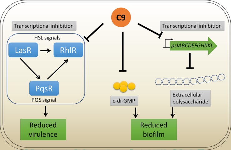 图2 香豆素-查尔酮共轭物C9抑制铜绿假单胞菌生物被膜与细胞毒性的机制