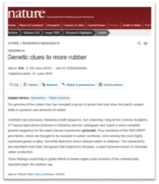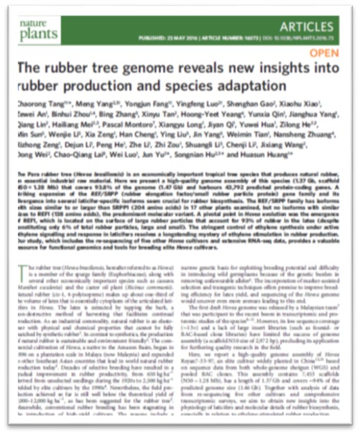 3.Tang, C*., M. Yang, Y. Fang, Y. Luo, S. Gao, X. Xiao, Z. An, B. Zhou, B. Zhang, X. Tan, H. Y. Yeang, Y. Qin, J. Yang, Q. Lin, H. Mei, P. Montoro, X. Long, J. Qi, Y. Hua, Z. He, M. Sun, W. Li, X. Zeng, H. Cheng, Y. Liu, J. Yang, W. Tian, N. Zhuang, R. Zeng, D. Li, P. He, Z. Li, Z. Zou, S. Li, C. Li, J. Wang, D. Wei, C. Q. Lai, W. Luo, J. Yu, S. Hu* and H. Huang*, The rubber tree genome reveals new insights into rubber production and species adaptation. Nat Plants, 2016. 2(6): p. 16073.