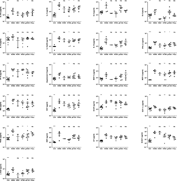 本研究首先系统分析了19例H5N6感染病例的临床特征。发现,与H5N1和H7N9病毒感染相比较,H5N6病毒感染病例具有更高频率淋巴细胞减少及较高的丙氨酸转氨酶(ALT)和乳酸脱氢酶(LDH)水平。通过对血清中48种细胞因子/趋化因子的检测,发现H5N6病毒感染呈现显著的“细胞因子风暴”特征,血清中多种因子的水平显著高于H7N9、H5N1和pH1N1病毒感染病例及细菌性肺炎病例,包括IL-2Rα、IL-12p40、IL-18、IFN α2、IP-10等。进一步对两例死亡病例和一例康复病例血清中细胞因子的动态变化进行了检测,发现康复病例血清中细胞因子水平在感染后快速下降,而两例死亡病例细胞因子持续处于高水平状态,提示持续高水平的细胞因子可能是造成H5N6病毒感染死亡的重要原因之一。