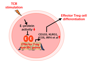 正常情况下,E蛋白可以直接结合在效应性Treg细胞相关分子的基因调控区,抑制这些基因的表达,E蛋白的缺失可以解除这种抑制,促进Treg细胞分化为effector Treg,倾向于迁移到非淋巴组织,表现出更好的免疫抑制活性及更好的稳定性;而TCR信号可以下调E蛋白的活性,进而解除E蛋白对effector Treg细胞相关分子表达的抑制,从而促进effector Treg细胞分化。