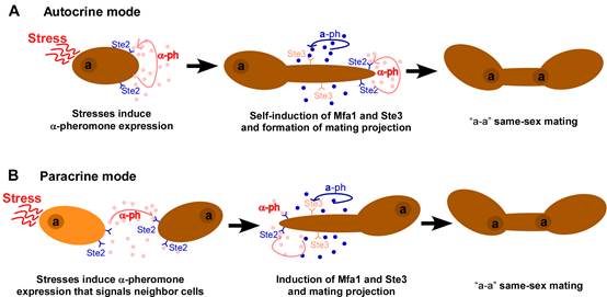 图. 环境压力诱导念珠菌通过信息素的自分泌(A)和旁分泌(B)途径促进同性交配