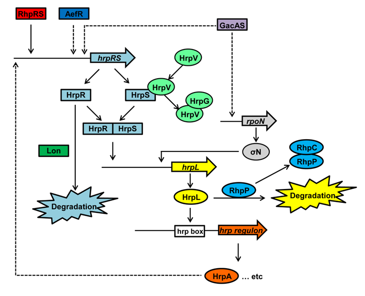 III型分泌系统是大多数革兰氏阴性病原细菌(包括植物病原菌和动物病原菌)感染宿主的重要“武器”,是由蛋白复合体构成的跨膜分子装置。病原菌通过III型分泌系统将一系列效应蛋白注入宿主细胞内,从而逃避宿主细胞的免疫防御并建立感染。III型分泌系统基因的表达受各种环境因素和宿主因素的影响,在丰富培养基中其表达受到抑制,而在植物细胞间隙或基本培养基中能够诱导其表达。尽管目前已经鉴定了一些调节III型分泌系统信号转导的组份,如,双组分系统GacAS,ATP依赖的蛋白酶Lon,NtrC家族的转录因子HrpR和HrpS等,但细菌如何感应环境信号并作出相应反应的机制还知之甚少。