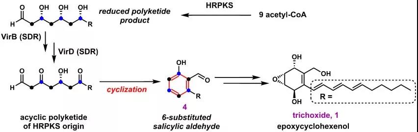 最近,研究人员通过基因组挖掘,证实来源于生防菌Trichoderma virens 的一个HRPKS基因簇(vir基因簇)负责合成环氧环己醇类新天然产物trichoxide(化合物1)。在研究该化合物的生物合成过程中,解析了一种合成芳香类聚酮化合物的新策略(图1):由HRPKS负责合成高度还原的线性聚酮产物,然后经由不同短链脱氢酶家族蛋白催化特定位置β-羟基的选择性氧化重新转变成β-酮,从而实现分子内的缩合环化,并最终芳构化形成6-取代水杨醛(化合物4)。