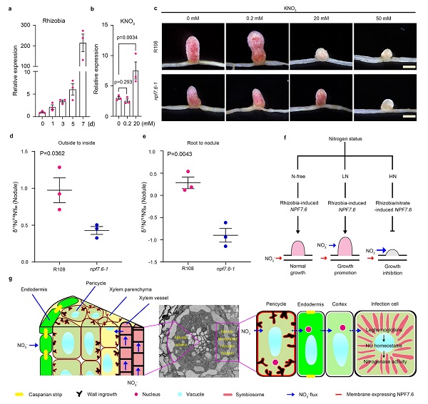 进一步研究发现:在无氮条件下,根瘤菌诱导NPF7.6基因表达,根瘤从宿主植物根系中吸收硝酸盐来维持根瘤基本生长;在低硝酸盐浓度下,根瘤菌诱导NPF7.6表达,根瘤吸收外界环境中的硝酸盐,避免了根瘤发育与宿主生长竞争氮源,从而促进根瘤发育;在处于高硝酸盐浓度环境中时,根瘤菌与高浓度硝酸盐同时诱导NPF7.6表达,促进硝酸盐吸收,根瘤中过量的硝酸盐抑制豆血红蛋白基因(Leghemoglobins, Lbs)的表达,扰乱一氧化氮(Nitric oxide, NO)稳态,进而抑制固氮酶(Nitrogenase)活性(图3f, g)。