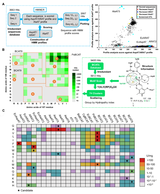 近日,中国科学院微生物研究所的吴边团队开发了一种基于转氨酶的多酶级联系统,能够直接将L-氨基酸氧化为对应的酮酸。该级联反应具有如下优势:使用廉价且可再生的底物,通过酶介导的氧气引入,将转氨酶的不利化学平衡转移到产物的合成方向,具备优秀的原子经济性。由于转氨酶一般只接受一组相似氨基酸作为底物,这种底物选择的严谨性阻碍了该技术的广泛应用。为了解决上述问题,该团队从生物信息大数据出发,通过一系列生物信息学与计算生物学结合的方法,寻找兼容上述级联反应的新型转氨元件以扩大其应用范围。通过对序列和结构的组合分析,研究团队建立了针对不同家族的转氨元件高效快速的计算筛选方法,将未知序列展开到二维平面上,通过对序列所在位置的分布进行计算筛选,从数据库中的一万余个转氨元件中选取了27个候选序列进行测试。最终建立了一个由6个具有互补的底物选择性的转氨元件构成的酶工具箱,实现了对天然L-氨基酸的全覆盖。
