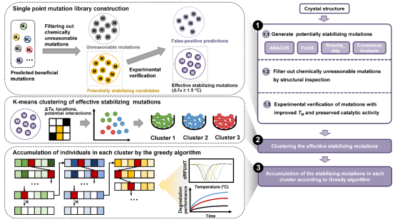 该团队首先采用融合策略,综合使用四种不同的单点预测算法辅以结构缺陷分析,预测了85个潜在有益突变。随后,他们对预测突变进行了实验检验,获得了21个有益单点突变(ΔTm ≥1.5°C)。通过K-means聚类算法,作者将21个有益单点突变分为3个Cluster,并依据贪婪算法(图2)对每个Cluster进行迭代叠加。