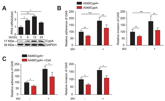 图1 流感病毒诱导的CypA促进A组链球菌的粘附和入侵