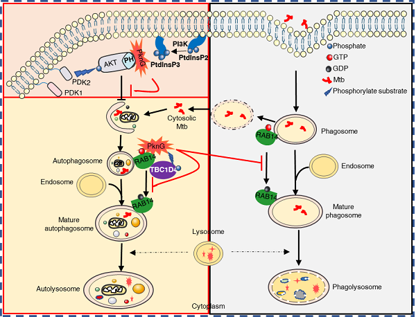 本研究的关键创新点和科学意义为:1)发现了Mtb中首个通过多节点调控宿主自噬流的Mtb效应蛋白PknG,揭示了Mtb寄居于细胞内新“避所”(未成熟自噬体)的免疫逃逸新策略;2)阐明了Mtb 直接结合并抑制宿主AKT的激酶活性进而诱导自噬发生的新机制,增进了对PI3K-AKT-MTOR通路及磷脂酰肌醇在病原-宿主互作界面的关键调控作用的认识; 3)鉴定了PknG在宿主细胞内的新型激酶底物AS160,并进一步揭示了其靶向宿主RAB14的双重调控机制:结合RAB14并阻断与其结合的GTP水解,磷酸化AS160进而抑制其针对RAB14的GAP活性。