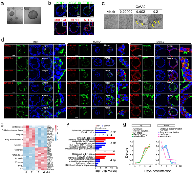 图1.人远端支气管类器官感染模型建立及其感染组学研究结果
