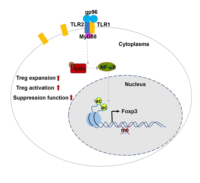 中国科学院微生物研究所的孟颂东团队十多年来长期从事热休克蛋白gp96免疫学功能研究。该团队近期研究发现,高剂量gp96免疫在系统性红斑狼疮Lyn-/-小鼠(SLE)模型中显示了明显的治疗效果,有效降低自身抗体滴度、滤泡辅助性T细胞和产生抗体的浆细胞水平。此外,gp96治疗可减轻小鼠自身免疫性脑脊髓炎(EAE)的发病和进展。机制研究发现gp96处理可显著增加Treg的比例、增殖能力和抑制功能,通过基因表达谱分析发现NF-κB家族成员p65和c-Rel是gp96增强Treg中Foxp3表达的关键转录因子。他们通过构建与Toll样受体(TLRs)结合部位的突变体gp96、TLR2敲除小鼠和Treg细胞特异性缺失MyD88小鼠,均证明gp96通过TLR2-MyD88介导的NF-κB信号通路激活了Treg细胞并诱导Foxp3表达。