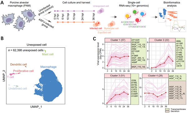 图1. 单细胞转录组测序揭示ASFV感染巨噬细胞的转录组图谱
