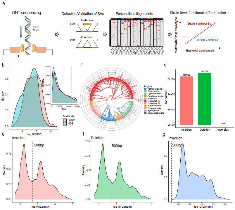 图1 本研究的技术路线(a),利用三代测序进行SV的深度解析,以及横断面/时间序列中SV的组成、动态分析,最终进行SV对代谢功能的影响判定。(b) 混合组装能够有效提高N50,并组装出大量的基因组(c),其中发现更多的insertion、deletion和inversion。