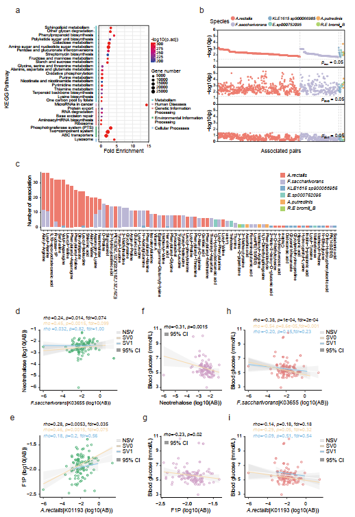 图2 肠道微生物中与SVs相关的功能研究结果。(a,b,c) SV影响基因富集结果; (d-i) SV影响单菌种内不同菌株与代谢产物以及血糖的关联。