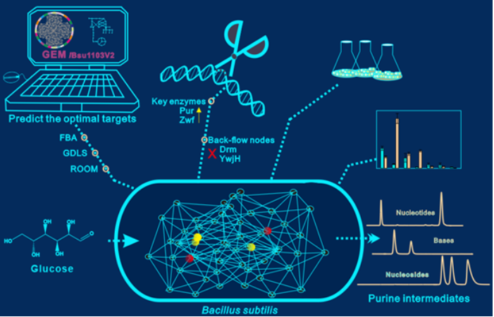 研究组在计算机指导下从细胞整体水平上分析嘌呤核苷合成的代谢调控机理,预测与筛选有效靶点。通过最优的改造策略快速获得了高效合成肌苷的工程菌以及通用底盘菌,为肌苷、鸟苷等核苷生产菌的选育提供了新的改造策略和实践经验。