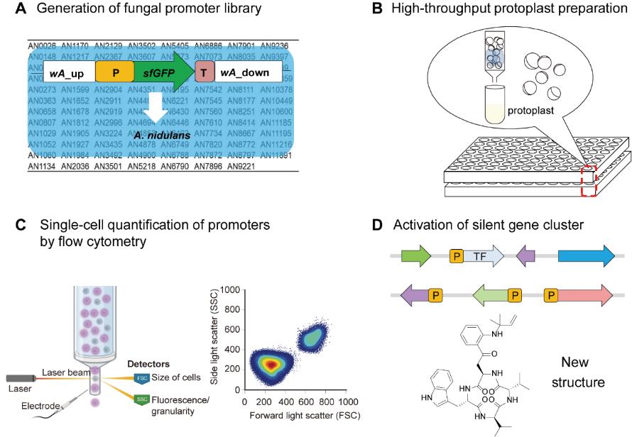 近日,中国科学院微生物研究所尹文兵研究组在Science China Life Sciences发表论文(Quantitative characterization of filamentous fungal promoters on single-cell resolution to discover cryptic natural products),以丝状真菌构巢曲霉为研究模型,建立了基于单细胞定量表征的丝状真菌启动子高通量筛选方法。