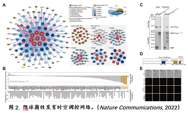 本项研究以异新生隐球菌(Cryptococcus deneoformans,研究隐球菌科真菌有性生殖的模式病原体)为研究模型,构建了该病原体中首个转录因子基因缺失菌株库。通过发展系统生物学方法,针对八个有性生殖时空发育性状建立了定量和半定量的评估策略,揭示了374个隐球菌有性生殖相关的分子调控-表型关联(图2A和2B)。借助基因进化年龄分析,发现双性生殖的分子调控网络较为古老。在该调控网络中,鉴定了一个未报道的保守真菌交配途径(pheromone MAPK pathway)的组分Fmp1(图2C)。不同于双性生殖,一个近期进化的调控通路激发与协调了隐球菌α同性生殖周期中的5个连续发育过程。发现了该通路的底层组分Cua1为新颖的纺锤体极体相关蛋白,其大多数功能结构域来自于病毒(图2D和2E),且Cua1同源蛋白的编码基因仅在具有α同性生殖能力的隐球菌科真菌中存在。这些研究结果显示古老和近期进化的调控通路分别控制了隐球菌双性生殖和α同性生殖过程,提示隐球菌特有繁殖方式—α同性生殖为近期进化事件,该繁殖方式的获得可能与病毒感染和基因水平转移有关。
