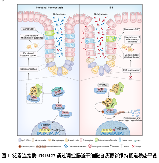 该研究组与微生物所汪静研究组、军事科学院军事医学研究院张令强研究团队最新合作研究揭示:泛素连接酶TRIM27是机体肠道稳态维持的关键调控因子。首先,团队通过收集肠易激综合征(irritable bowel syndrome,IBS)和炎症性肠病(inflammatory bowel disease,IBD)两种常见的肠道稳态失调疾病患者的肠道组织微阵列数据,并对其进行基因表达分析发现,TRIM27在两类疾病患者中的基因表达水平均发生显著变化,提示其是肠道稳态维持的重要宿主遗传因子。有趣的是,TRIM27在IBD患者的肠道组织中高表达,而在IBS患者尤其是腹泻型IBS(diarrhea predominant IBS,IBS-D)患者中低表达,表明TRIM27可能在肠道稳态维持中发挥精准的调控作用。团队成员进一步通过构建Trim27全基因敲除(Trim27-/-)小鼠发现,缺失TRIM27的小鼠表现出内脏超敏性增加、排便颗粒数增多、肠黏膜低度炎症、肠道屏障受损及肠道菌群失调等IBS样症状,而且这些症状随小鼠周龄增加而逐渐加剧。随后的机制探索实验表明,TRIM27主要定位于小鼠肠道干细胞(intestinal stem cells,ISCs)中,以CC(coiled-coil)结构域依赖而泛素链接酶活性非依赖方式竞争性结合β-catenin的ARM(Armadillo)结构域,进而抑制GSK-3β- CK1-Axin复合体介导的β-catenin的磷酸化修饰及其后的泛素化修饰和蛋白酶体降解,从而提升β-catenin蛋白稳定性以促进Wnt/β-catenin信号通路的活化,最终促进ISCs的自我更新。这一机制也在肠道干细胞特异性敲除Trim27(trim27[Lgr5])的小鼠中得到了验证。此外,Wnt/β-catenin信号通路激活剂SKL2001和益生菌制剂处理trim27[Lgr5]小鼠可有效恢复ISCs的自我更新能力,进而缓解trim27[Lgr5]小鼠的IBS样症状(图1)。