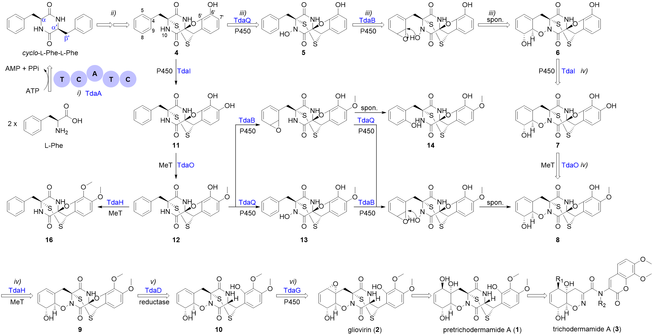 ETPs是一类由真菌产生的次级代谢产物,其中一个亚类pretrichodermamides含有独特的α, b'-二硫桥、1, 2-噁嗪环和复杂的多环结构(A–F环,图1),复杂的结构加大了其有机合成的难度,严重制约了pretrichodermamide的药用开发。因此,研究pretrichodermamides的生物合成途径是理解该类次级代谢产物结构复杂性和多样性的关键手段。