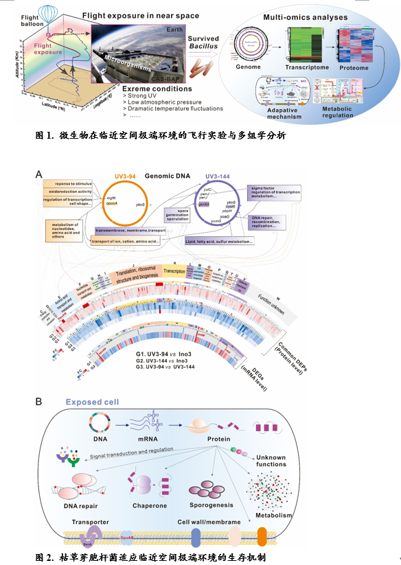 地球临近空间是指离地表20-100公里之间的大气区域。该区域辐射水平高,大气压低,具有研究生命生存和进化的类火星环境条件。探究微生物在临近空间的生存和适应机制,有助于理解地球生命的生存极限。温廷益研究团队与中国科学院地质与地球物理研究所等研究团队合作,利用临近空间天体生物学综合飞行实验平台CAS-BAP(Chinese Academy of Sciences Balloon-Borne Astrobiology Platform),在我国内蒙古海拔32公里区域开展了多种典型地表微生物的飞行实验。本次实验暴露时长3小时17分钟,并针对暴露后样品的存活率、代谢产物、基因组、转录组和蛋白组等进行了综合分析。筛选出暴露存活的芽胞杆菌,并获得肌苷合成明显变化的突变菌,首次证明了临近空间可作为一种新的微生物进化平台。多组学分析显示突变株的基因组、转录组和蛋白质组水平发生级联变化,且EMP、PPP和嘌呤合成相关途径的代谢通量显著改变,从而增加/减少肌苷的生物合成。进一步分析表明,与翻译、分子伴侣、细胞壁/膜、孢子形成、DNA复制/修复和抗氧化等环境适应相关蛋白的表达显著上调,使突变株能够有效修复DNA/蛋白质损伤,提高对抗环境胁迫的生存能力,为揭示微生物适应极端环境的生存机制提供了新的认识。