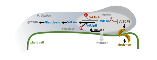 图1.大丽轮枝菌VdUlpB介导的VdEno去SUMO化解除效应蛋白VdSCP8表达抑制促进侵染的工作模型