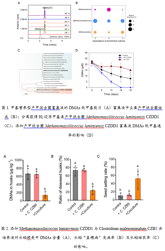 随后,本研究将具有DMAs脱甲基能力的产甲烷马赛球菌CZDD1与梭菌共培养液添加至水稻土中,降低了水稻对DMAs的积累,有效缓解了水稻“直穗病”(图2)。