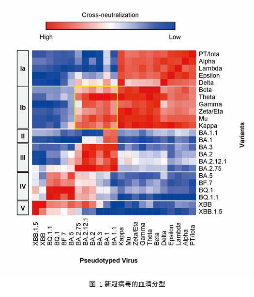 研究者基于前期开发的mRNA疫苗设计与评估平台,以小鼠血清交叉中和的方法系统研究了23种具有代表性的新冠病毒毒株的RBD抗原性,并根据抗原性的相似性划分了5种血清型。其中,I型包含了Omicron出现之前的所有变异株,且根据抗原性特点可以进一步分为Ia和Ib两个亚型。II-V型则涵盖了处于不同进化阶段的多种Omicron亚型,包括BA.1,BA.2,BA.5和XBB等。基于不同血清型的抗原性数据(图1),即可方便的选取具有代表性的毒株作为抗原设计多价广谱疫苗和抗体,也可以对新型变异株进行归类以快速评估其免疫逃逸能力。