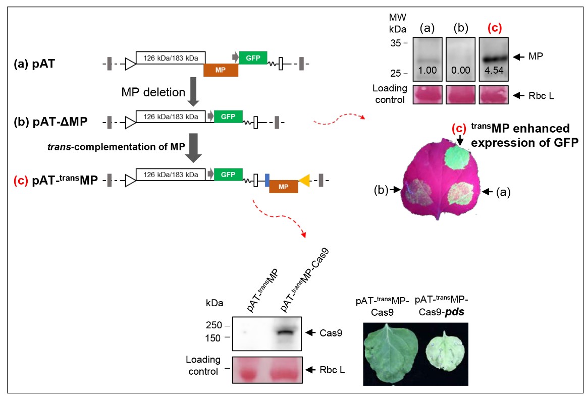 植物病毒载体在表达外源蛋白和对寄主/病毒的基因功能研究等方面具有高效快捷等优点,但因病毒载体的容量限制和表达量低等缺陷,限制了其应用范围。方荣祥团队在基于TMV基因组表达多种外源蛋白的应用过程中观察到目标蛋白的分子量大小以及其表达量与载体中TMV运动蛋白(MP)的含量紧密相关。由此开启了在病毒载体中通过删除TMV-MP,以及MP的反式回补等“重构TMV载体”策略,开发了一种基于TMV 基因组的新型pAT-transMP 载体系统,应用该系统不仅显著提高了植物体内瞬间表达外源蛋白(GFP,GUS等)的表达量,而且有效表达了用于基因编辑的Cas9高分子量蛋白(162 kDa)。该系统还实现了同时表达多个目标分子,例如在pAT-transMP载体中同时表达Keytruda(PD-1抗体)的重链和轻链,在植物细胞中成功获得了PD-1完整抗体;另外,由于该载体能同时表达Cas9蛋白和含有靶标序列的gRNA表达盒,构建了基于TMV的瞬间表达对植物基因进行有效编辑的新策略。
