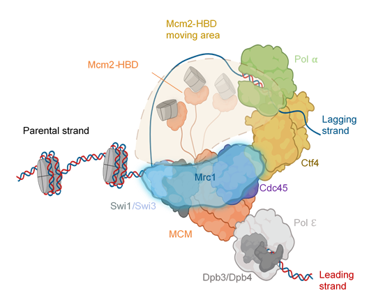先前的研究表明,亲代组蛋白H3-H4向DNA后随链的转移需要DNA复制机器中两个关键蛋白:Mcm2和DNA聚合酶α。由于Mcm2在复制体的最前端,而DNA聚合酶α位于复制体的后部,因而组蛋白如何跨越复制体进行传递的机制并不明确。另外,Mcm2一般位于先导链上,如何调控后随链组蛋白的分布一直是一个谜。本研究发现,一个名为Mrc1的复制体蛋白在亲代组蛋白H3-H4向后随链的转移过程中发挥关键作用,从而确保异染色质的正确遗传。团队通过一系列包括高通量遗传筛选、染色质免疫沉淀和eSPAN等在内的实验分析,详细阐明了Mrc1的作用机制,发现Mrc1能够将Mcm2导向DNA聚合酶α(图1),对调节亲代组蛋白向后随链的转移过程至关重要。