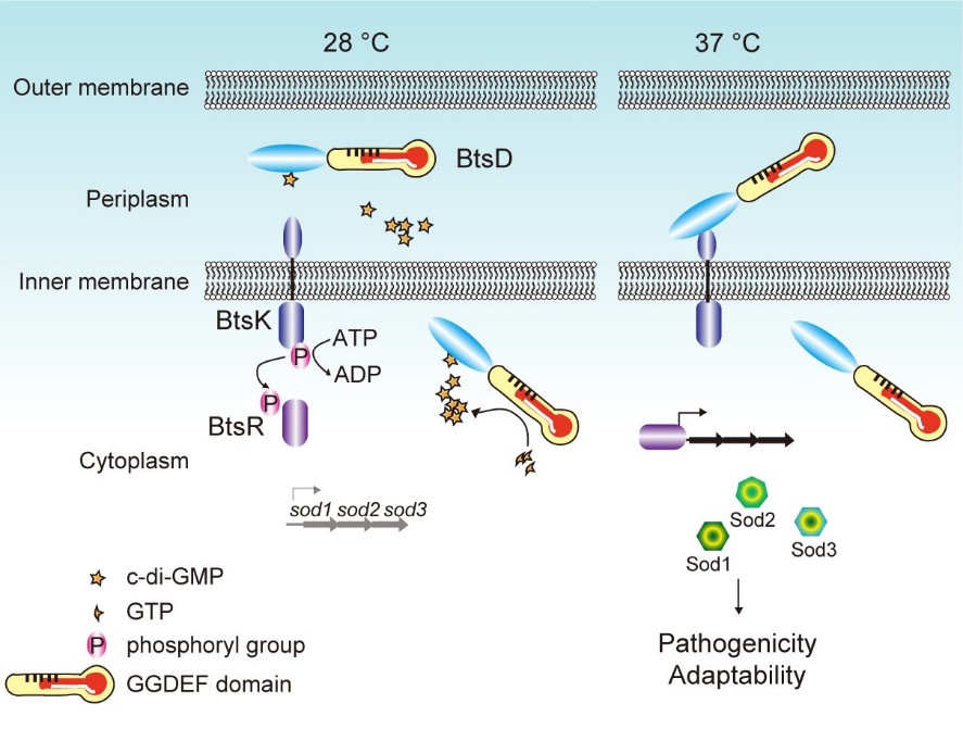 环境细菌如何感知宿主信号从而成为条件致病菌是微生物学研究的前沿课题。Sma是一种在土壤、水体、空气中普遍存在的环境微生物,特殊条件下具有致病力,其感染和致病力受到宿主多种信号的激活和调控。研究发现,当BtsD感知37 ℃体温时,会降低第二信使c-di-GMP的合成及其在周质空间的水平,解除c-di-GMP对BtsD N端的抑制作用。体温感知进一步激活了双组分信号转导系统BtsK-BtsR的调控功能,使sod1-3基因簇的表达上调,提高了细菌对氧化胁迫的耐受力和致病力。本研究的数据支持c-di-GMP浓度变化在亚细胞水平具有重要调控作用,同时,揭示了BtsD发挥信号受体和效应蛋白的功能多样性。