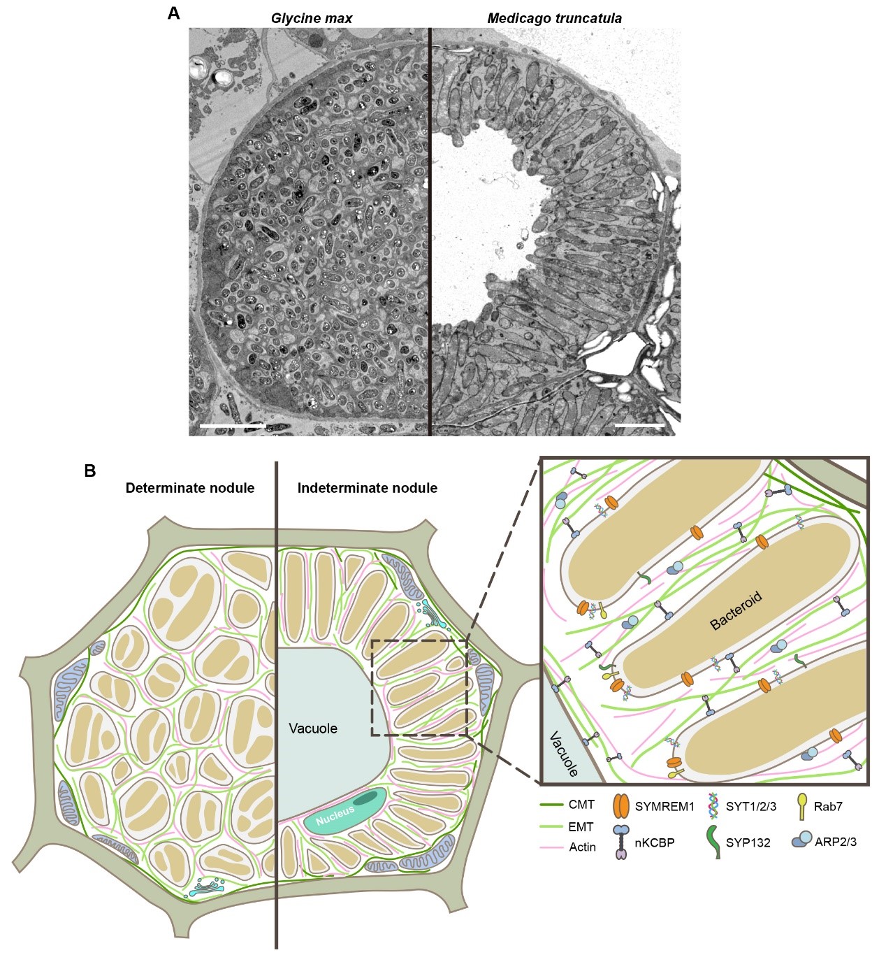 豆科植物与根瘤菌形成的共生固氮体系是植物氮素重要的天然来源,对发展绿色可持续农业具有重要意义,二者互作需要根瘤菌在根部表皮细胞成功侵染和皮层根瘤器官形成两个过程在时空上的协同作用,最终形成具有固氮能力的根瘤(图1)。该文章首先定义了植物独特的细胞壁-膜系统-细胞骨架(cell Wall-Membrane system-Cytoskeleton, WMC)连续体,并系统地总结了WMC连续体在根瘤菌入侵、侵染线形成及延伸、根瘤菌释放及内共生等重要细胞生物学过程中的功能及作用机制(图2-4);最后,提出了多个豆科植物-根瘤菌共生互作领域共同关注、亟待解决的重要细胞生物学问题,将为实现高效共生固氮和绿色农业发展提供理论依据。